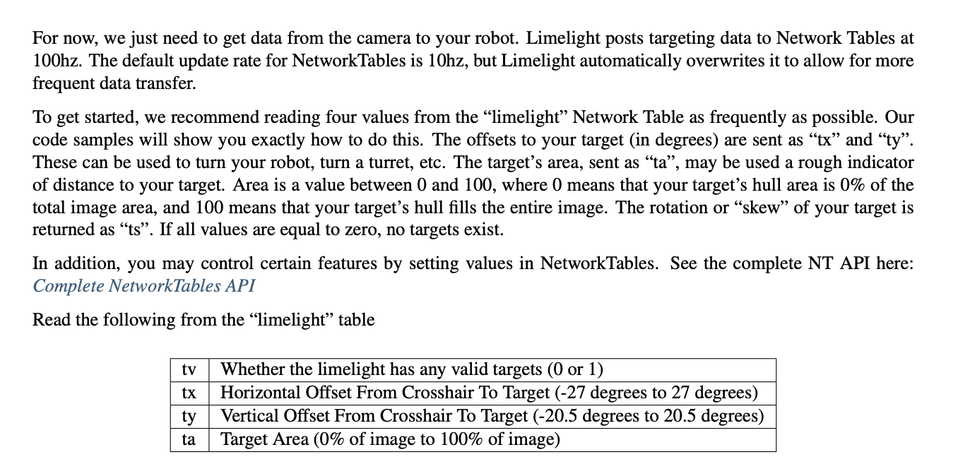 import edu.wpi.first.networktables.NetworkTableInstance;NetworkTable table = NetworkTableInstance.getDefault().getTable("limelight");