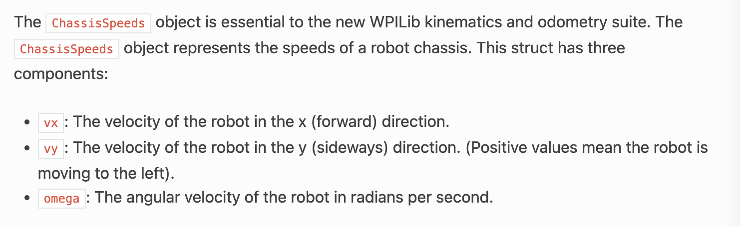 The purpose of kinematics1 is to convert between a universal ChassisSpeeds class (view docs) to multiple SwerveModuleState classes, which contains velocities and angles for each wheel of our drivetrain. SwerveDriveKinematics is the Writing to ChassisSpeeds will change the swerve module state and move our robot!